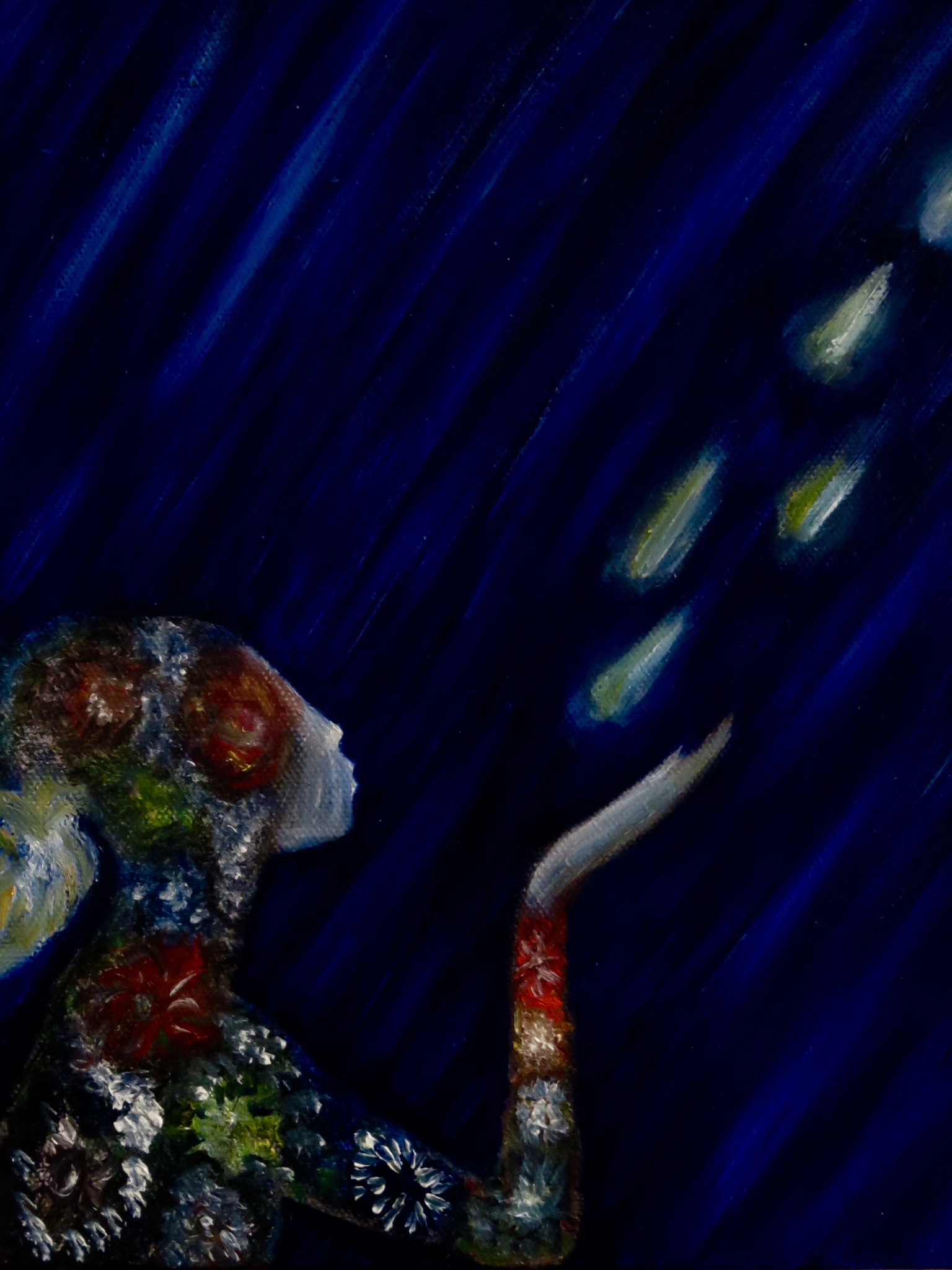 Beautiful. I love the fireworks that seem to make up Varda's body, and the way in which you painted her breathing the stars into the sky. There's a real sense of tenderness, but also of motion. Great use of contrast and colour!