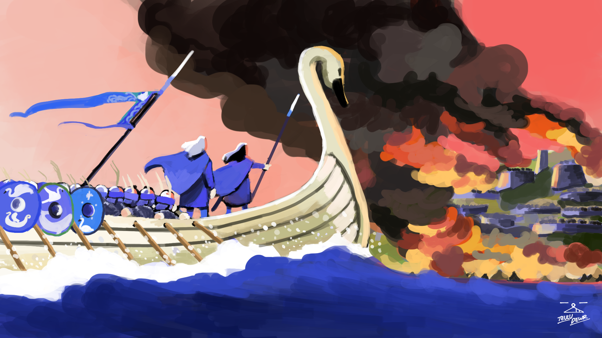 Sirion by Tang Wen Xi. Cirdan and Gil-galad arrive by swanship to Sirion in flames.