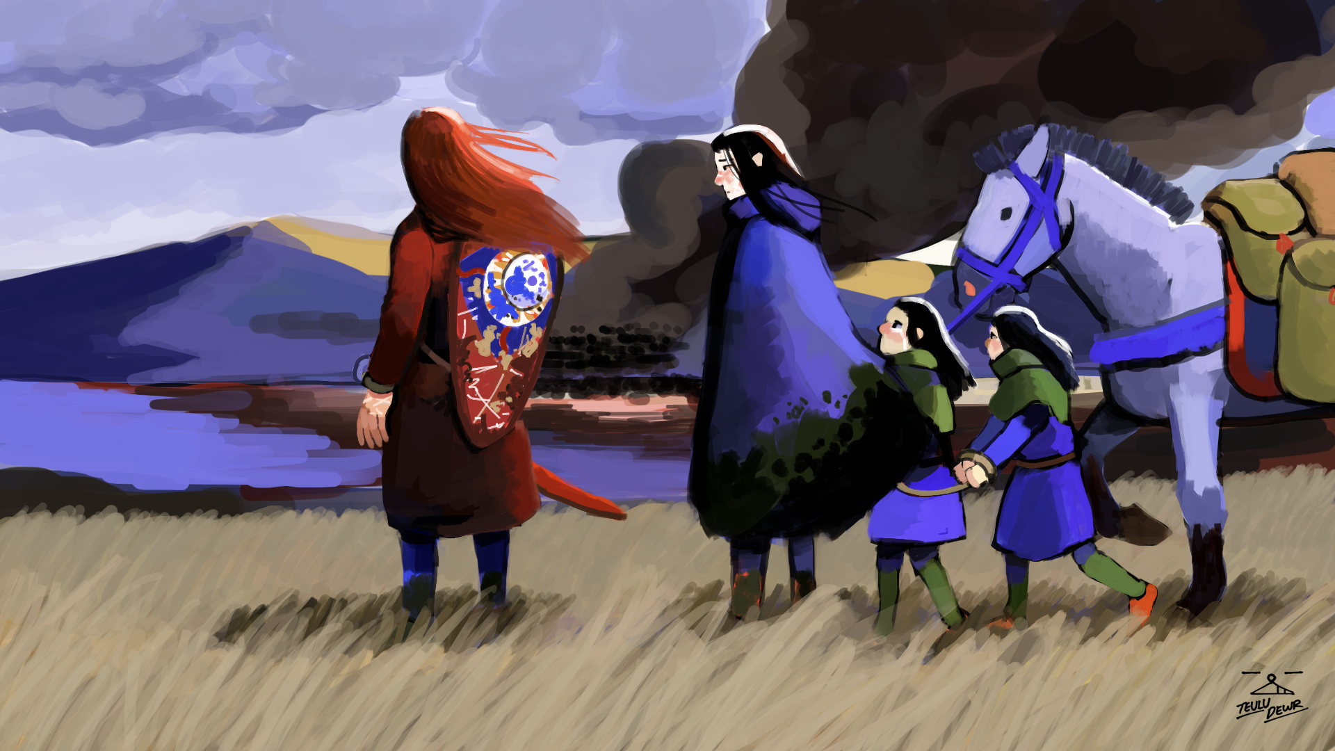 Sirion by Tang Wen Xi. Maedhros and Maglor with Elrond and Elros as young children, looking over the landscape.