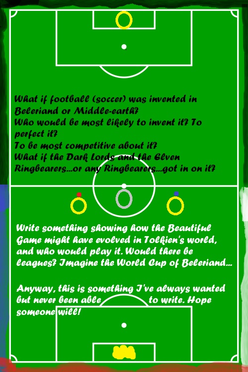 An association football (soccer) pitch with some Rings of Power on it. On it is written in black and white script, my pitch (ha) to the artists: What if football (soccer) was invented in Beleriand/Middle-earth? Who would be most likely to invent it? To perfect it? Who would be most competitive about it? What if the Dark Lords and Elven Ringbearers--or any Ringbearers--got in on it?
