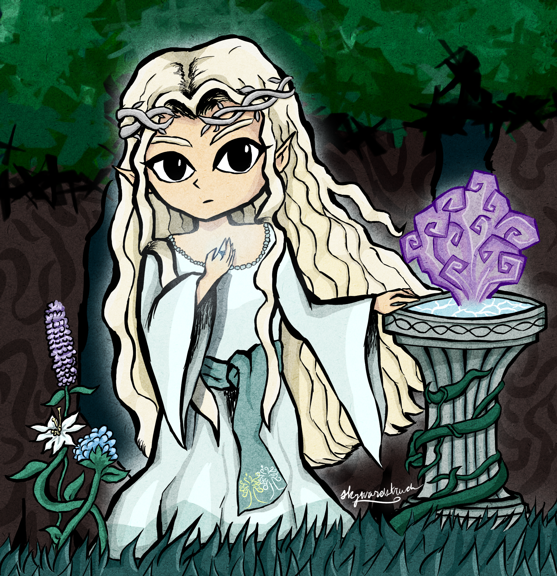 This piece began as a little sketch I drew in class to cure my boredom, but as I rendered it digitally, it quickly became something bigger. Coloring this was challenging, especially with how complicated Galadriel's hair is, and all of the details I added to the piece. I've always wanted to draw Galadriel in Wind Waker style- I think the aesthetic fits her so well, and I'm really happy with how this piece turned out!